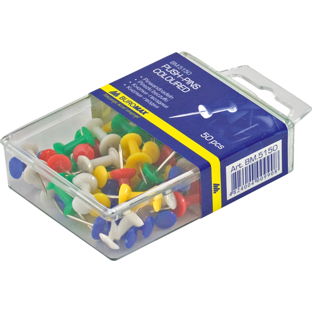 Пластиковий контейнер із кольоровими кнопками-гвоздиками від BUROMAX дуже зручний у використанні. Кнопки-гвоздики призначені для фіксації інформації до пробкових та тканинних дощок. Виготовлені з якісного кольорового (білий, жовтий, зелений, синій) пластику циліндричної форми. Довжина голки: 10мм. Упаковані у пластиковий контейнер із завісою по 50 штук.