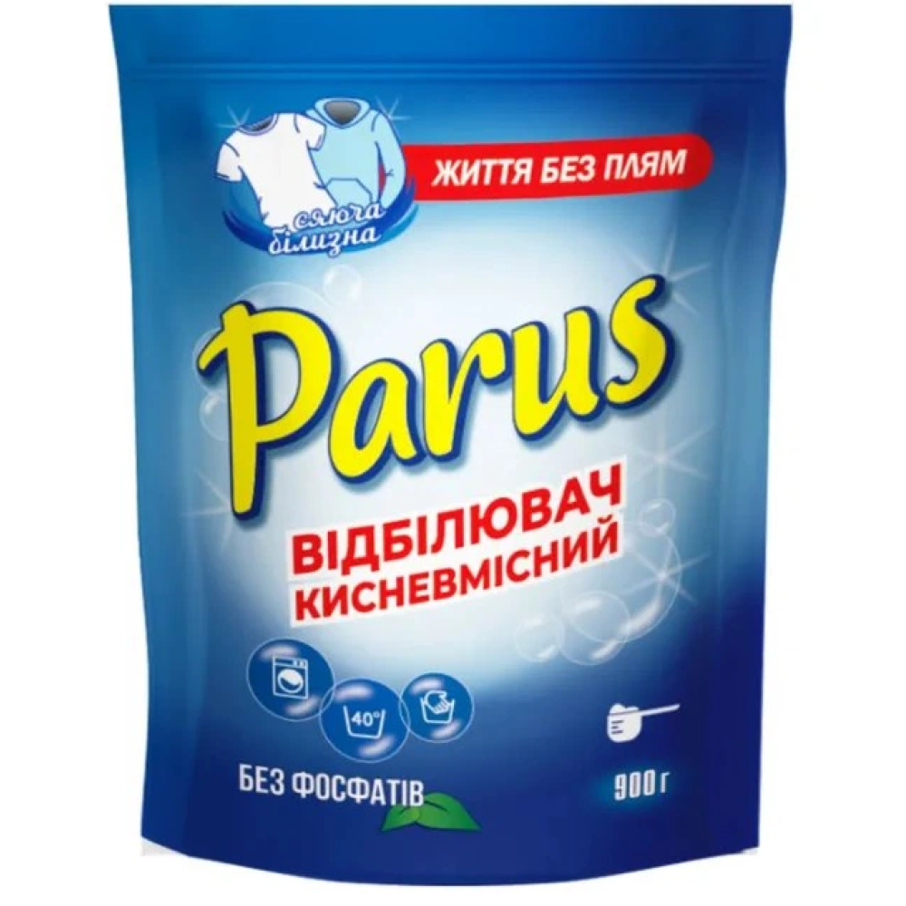 миючий засіб PARUS "Сяюча білизна"– відбілювач кисневмісний для білих тканин, призначений для виведення плям і антимікробної обробки виробів із бавовняних, лляних, синтетичних тканин як при ручному, так і машинному пранні. Виводить плями, які складно усунути (чай, кава, вино, кров, ягоди, фрукти та інше). Зберігає й освіжає яскравість білої білизни. Не пошкоджує структуру тканин. Посилює дію прального порошку, покращує якість прання.